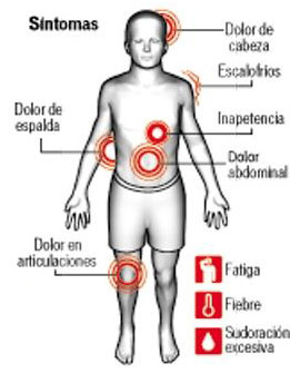 sudoración, escalofríos, adelgazamiento y dolores generalizados.